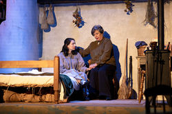 "Thanks to Alex Meyer’s clever scenic design, Hermione, attended by Paulina, is visible in her elevated room throughout the play, while the bear, Donna and Perdita are downstage in the more expansive Bohemia, with Sophina Flores’ subtle lighting to expertly guide us between the two spaces."